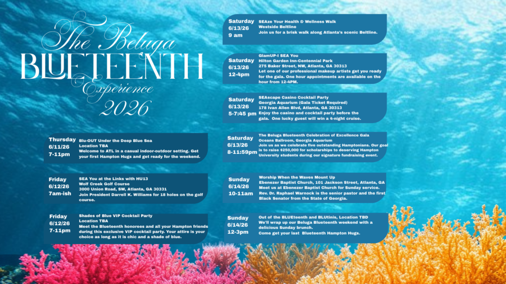 The Blueteenth Experience is our chapter’s signature annual fundraiser. It is our opportunity to celebrate the accomplishments of outstanding Hamptonians while raising funds to support our chapter’s current use and endowed scholarship funds.The Blueteenth Experience generally occurs on the weekend closest to the Juneteenth federal holiday. Hamptonians and friends of the university travel to Atlanta for four days of fun-filled festivities that are highlighted by the overwhelming and generous financial support of donors for current and incoming Hampton University students. Please visit our Calendar of Events for the upcoming Blueteenth Experience dates.